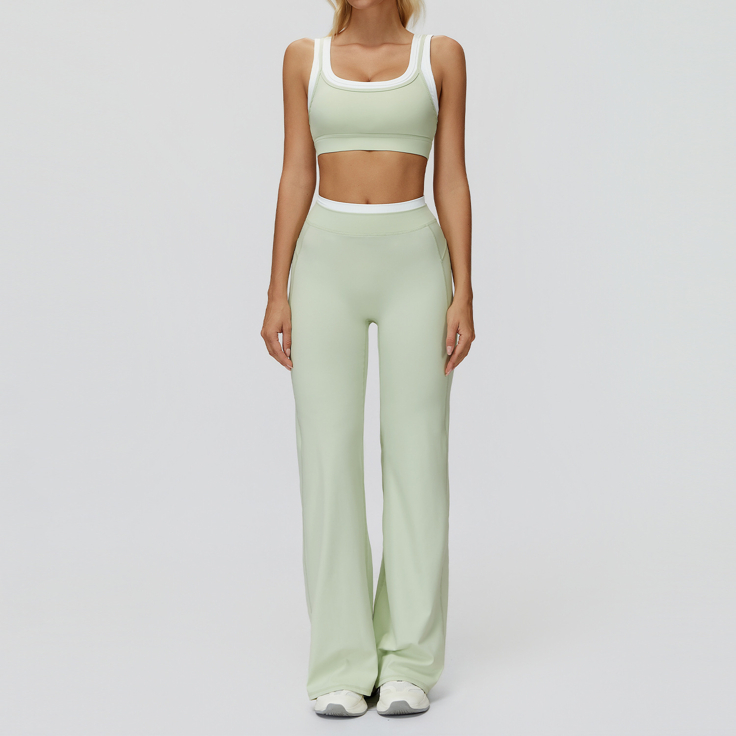 Sage Green Flare Set: High Waist Bell Bottoms & Built-in Bra Tank, Yoga Practice